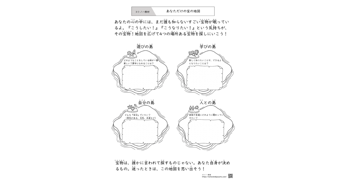 「遊び」「学び」「人間関係」「自分自身」の4つのエリアで、お子さんの心の中にある宝物(大切にしたい価値観)を言語化するサポートにお使いください。